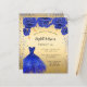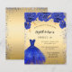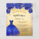 Een moderne, stijlvolle en glamoureuze uitnodiging voor een Sweet 16, 16th verjaardagsfeestje. Een faux gouden achtergrond met faux blue sparkles en een royal blue dress en rozen, florals. De naam is geschreven met een modern handschrift. Personaliseer en voeg uw feestdetails toe. 1 vel = 1 uitnodiging afgedrukt rand tot rand.