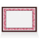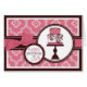 Elegante taart met 3D-look lintboeg en labels boven een roze dampafdruk.