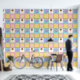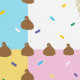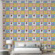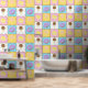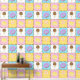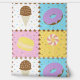 Tevreden je tand met dit kleurrijke patroon met smaakvolle taartjes zoals een chocolade-ijsje, een paarse bevroren chocolade donut, een citroengele macaron, en een roze en witte, gedraaide lolly, gescheiden door chocolade chips en omringd door regenboogsproeiers op vier helder gekleurde vierkanten.