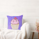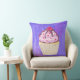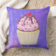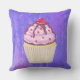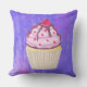 Een kussen met een illustratie van een heerlijk uitziende cupcake. Roze vorst en chocoladedrizzels. Een gele cupcake-houder en een frambozen bovenaan. Jummie! De achtergrond is een paarse abstracte textuur met weinig harten die door worden gepeperd.
