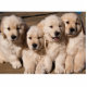 Een foto van vier schattige Golden Retriever-puppies die op een wang-tot-wang lijken en speels en blij zijn.