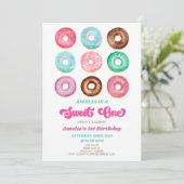 Dit is een Sweet One 1st Birthday Invite met een donut en sproinkles thema. Het ontwerp bestaat uit donuts met blauw, roze, paarse, groene en bruine chocolade die wordt gevorst en sproinkles. Gemaakt voor een eerste verjaardag!
