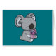 Een grijze koala die een roze gevulde puppy dog speelgoed bedekt.