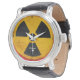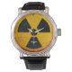 Het ontwerp heeft een stralingssymbool op een rode achtergrond.