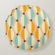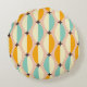 Symmetrical retro pattern with interlocking teal, yellow, and orange shapes on a beige background. Black star-like accents add contrast, creating a vintage feel.