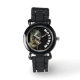 Dit dynamische horlogeontwerp heeft een felle T-Rex die brult tegen een strakke zwarte achtergrond, ideaal voor dinosaurusliefhebbende kinderen van alle leeftijden. Het gedurfde dinosaurus-afbeelding wordt aangevuld met een aanpasbare naam die wordt weergegeven in scherpe, witte blokletters, waardoor een leuke en persoonlijke touch aan het wijzerplaat wordt toegevoegd. Ideaal voor iedereen die van prehistorische thema's houdt, dit horloge combineert speels design met praktische bruikbaarheid, waardoor het een opvallende accessoire is voor dagelijkse draag. Het gedetailleerde T-Rex-artwork voegt een avontuurlijke sfeer toe, perfect om je liefde voor dinosaurussen op een unieke en stijlvolle manier te laten zien.