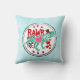 Een kussen met een afbeelding van een groene t-rex met een zwarte hoed met harten en bloemetjes rondom. Tekst zegt Rawr betekent dat ik van je hou in t-rex.
