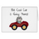 Een kat in een rode auto en een tekst die "Deze Koele Kat leest is Gaande Plaatsen!" op de t-shirts van het kattenontwerp, mokken, kaarten, stickers, bolsazakken, sleutelhanger, en andere iems.