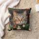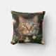 Close-up van een tabby kat in een kerstboom met rode en gouden ornamenten