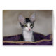 Een grijs en wit keukenblad met grote oren zit in een paars bed. Op de achterkant van de kaart wordt hij gesmokkeld met zijn zus van calico.