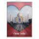 Het afbeelding van Taj Mahal is omringd door een hartvormig lijst en heeft de woorden "Ik hou van India" eronder.