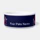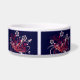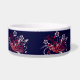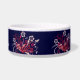 Dit ontwerp is een tattoo van veel verschillende bloemen, bladeren en wijnstokken. Er vliegen een paar vlinders rond de bloemen. De kleuren van het tattoo zijn een rode kleur met een vleugje perzik. Er zijn 4 design op het gerecht die rond de zijkanten van het gerecht gaan. Dit hondengerecht kan worden aangepast met de naam van uw huisdier op de voorkant van het gerecht.