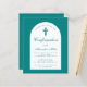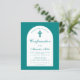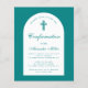 Een moderne bevestigingsuitnodiging voor een jongen. Op een turquoise blauwe achtergrond heeft het een witte boog met turquoise tekst binnenin. De gelegenheid en de naam zijn geschreven in een elegant kalligrafisch schrift; de eerste regel is gebogen tekst.
