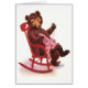 Teddy beer die in een rode rotsstoel zit, naait een kledingstuk voor een van haar cubs in deze illustratie uit een kinderboek uit 1907.