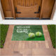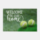 Tennisballen staan op groen gras voor tennisspeler thuis, hete deurmat