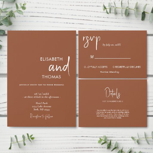 Terracotta eenvoudige bruiloft elegante uitnodigingen buik bands.