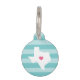 Laat je goede vriend shows wat trots van de thuisstaat met dit schattige Texas pet ID-label. Het ontwerp is voorzien van een witte silhouetkaart van de staat Texas met een roze hart binnenin, op een toon op de tonus turquoise stripe achtergrond. Voeg de naam van uw huisdier en contactinformatie aan de rug in witte letters op een aqua achtergrond toe.