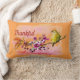 Lumbar Throw kussen worden getoond met een mooie kleurrijke kersenbloesem en vinkafdruk. Tekst van "Thankful" vooraan bij het coördineren van Bourgogne. Kleuren: Perzikkleurig, knijpt groen en oranje-golds met wit. De achtergrond en de rug van de peach zijn stevige kleur van gelijkaardige Perzikkleurig. Pas deze kussen aan of koop zoals het is.