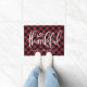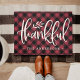 Persoonlijke welkomstmat in roestrood en zwart gebuffel met gebufferde gebufferde kenmerken "thankful" in handgeschreven kalligrafiescript, voorzien van een spreiding van herfstbladeren. Pas uw namen of familienaam onderaan aan aan voor een perfecte manier om herfstvrolijken toe te voegen aan uw deur dit Thanksgiving seizoen.