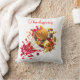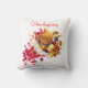 Gooi kussen met mijn computerkunstwerk van een hoorn des overvloeds vol pompoenen, appels, sinaasappels, dennenappels, druiven, maïs en rode herfstbladeren. De tekst zegt "Thanksgiving".
