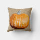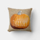 Deze vakantiepieltje is voorzien van een pompoen oranje pompoen die klaar zijn voor de oogst en de woorden "geef bedankt" in wit. De achtergrond is een faux burlap/woven patroondruk in kleurtinten van bruin, vergelijkbaar met een graanzak.