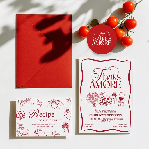 Celebrate love, laughter, and la dolce vita with this elegant “That’s Amore” bridal shower invitation. Designed with custom red typography, refined lettering, and charming Italian-inspired icons and doodles, this invitation captures the romance and joy of an Italian-themed celebration.