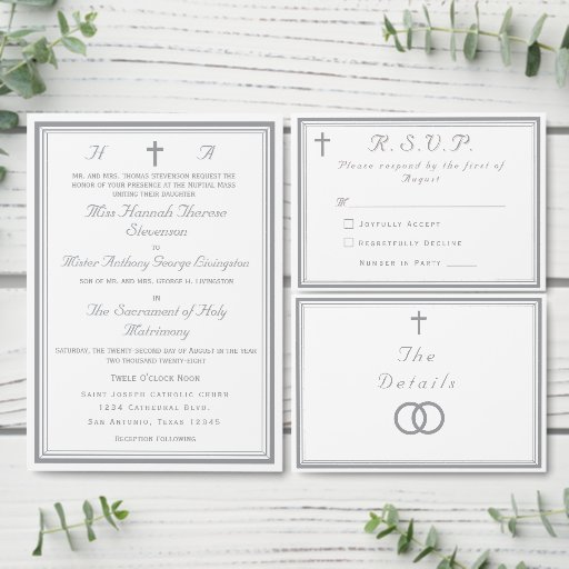 Design front features a pure white background to elegant, silver-colored text displayed in the proper format for a traditional Catholic wedding invitation. The image of a cross is displayed at top center between the initials of bride and groom. Entire design is framed by a fine, elegant border which adds a classy appearance to the design.