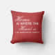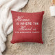 Een gepersonaliseerde gooi kussen met de achternaam van de familie, geschreven op een rode textielachtergrond, samen met de tekst "Thuis is waar het hart is". Deze douane gooit kussen een groot cadeau voor elke gelegenheid.