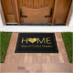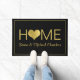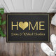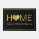 Een moderne 'thuistekst' is een grote doormat met gouden hart en je voornaam en achternaam. Goud en zwart. Een perfecte wandelmat voor nieuwigheden.