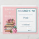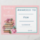 Een fel kleurrijk uitleescertificaat dat geschikt is voor gebruik door een leraar voor een presentatie in een schoolklaslokaal of op een schoolassemblee. Dit roze certificaat kenmerkt een afbeelding bibliotheekboeken en kan worden gepersonaliseerd om de naam van de student en de persoonlijke verwezenlijking te omvatten. De datum en de naam van de leraar kunnen ook gepersonaliseerd worden. Eenvoudig en eenvoudig in te vullen. Goede bron voor leraren.