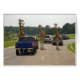 Een grappige foto met drie giraf die in het midden van de weg draait.
