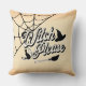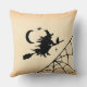 Halloween thema kussen met een afbeelding van een heks, kat, bezem en maan.