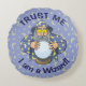 Oude tovenaar met blauwe cape die kijkt naar een kristalmagische bal.