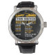 This humorous wall clock outlines the varying hourly rates for a tow truck driver based on the customer's behavior. Against a black background with a golden-yellow rim, it features a yellow car being towed by a yellow tow truck. The chart humorously lists increasing rates for different scenarios: "$150/HR MINIMUM", "$175/HR IF YOU WATCH", "$200/HR IF YOU HELP", "$250/HR IF YOU WORKED ON IT FIRST", and "$350/HR IF YOU TELL ME HOW TO DO MY JOB." It's a witty piece perfect for a tow truck driver's garage or office.