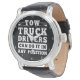 This humorous wall clock showcases the versatility of tow truck drivers. Against a black background with a clean white rim, it features silhouettes of tow trucks at the top and confidently states: "TOW TRUCK DRIVERS CAN DO IT IN ANY POSITION". This witty design is perfect for any tow truck operator with a sense of humor. The design tool can also be used to add custom text if you want your name or company on this clock. You can customize the color of the frame to any color you desire by going into the design tool.
