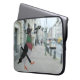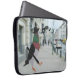 Deze laptophoes is voorzien van mijn cartoon-stijl afbeelding van een dapper duif met een pet, fluitend een vrolijk deuntje en met een paraplu, lopend langs een stadsstraat.