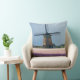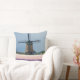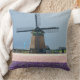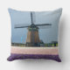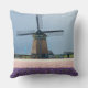 Op een lentedag bij Keukenhof in de regio Bulb in Holland gooien foto's een kussen met een traditionele, ontdooide windmolen achter een veld vol roze en paarse hyacintebloemen.