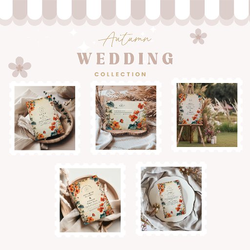 Vier uw speciale dag met dit romantische herfst ontwerp met waterverf achterblijvende bloemen in warme oranje tinten. Met een zacht achtergrond en botanische details is het ideaal voor een mooie herfstbruiloft. Alle tekst is volledig aanpasbaar.