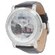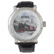 Een gepersonaliseerd horloge met een foto van een ijzig winterlandschap met besneeuwde pijnbomen. Een rode, gouden en zwarte ouderwetse trein die door de wildernis rijdt.