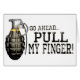 Ga je gang, trek mijn vinger. Voor het grootste deel is het trekken van een elkaars vinger, vooral als het vader is of zelfs een oom is een gekke pottige humor, die vaak slechts leidt tot een vlek die zeker een paar giechels zal veroorzaken en misschien zelfs een wijdverbreide lachen. Ons ontwerp van mijn vinger is voorzien van een oude handgranaat met de klassieke slogan. Voorzichtigheid: Let op degene die dit t-shirt draagt, want je bent gewaarschuwd dat een onvoorstelbare explosie van nare onzin je zeker zal overwinnen als je besluit die vinger te trekken.