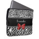 Een trendy zwart-wit dierenpatroon Laptophoes van 13 inch met moderne zebrastrepen aan de onderkant en een stijlvolle luipaard aan de bovenkant, voorzien van een korrelig rood lintje dat vastgebonden is aan een boog. Pas de mode laptophoes van deze chique vrouwen aan door jouw naam toe te voegen. Vat afbeelding, geen echt lintje.