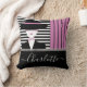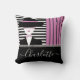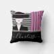 Trendy chic dame met een pet kussen. Een zeer chique en elegante dame in zwarte kleren en zwart pet. Zwart-witte, zwarte en donkerroze strepen. Prachtige aanpasbare handgeschreven typografie met jouw naam. Voeg eenvoudig jouw naam toe en personaliseer de kussen.