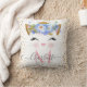Trendy kat prinses monogram kussen. Prachtig kat prinses gezicht in roosgoud, roze rood en gouden glitter, roze hartvormige neus en grote zwarte wimpers, met een kroon en blauwe bloemstuk, roze rood en gouden tinten. Aan de zijkanten nep gouden roze glitter confetti. Gemakkelijk aanpassen en uw naam en monogram toevoegen om de kussen te personaliseren.