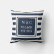 Elegante gepersonaliseerde initiaalmonogramkussenhoes met een navyblauw en wit gestreept patroon met uw initialen en familienaam met uw gevestigde datum in een navyblauw omrande vierkant met een klassieke witte tekst. Ontworpen door Thisisnotme©