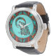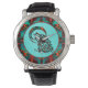 Dit is een unieke "Een van een soort" tribale Wolf Watch! Het is voorzien van een kruidenwolf uit het zuidwesten die naar de maan op een Turquoise-achtergrond springt... omringd door een Turquoise, Oranje en zwarte grens. Origineel kunstontwerp door artiest Kerry Miller.