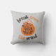 Een kussen met de uitdrukking "Break from the Grind" in vetgedrukte letters, vergezeld van een afbeelding van een Halloween-pompoen vol met lekkernijen, die een zoete en feestelijke ontsnapping uit het dagelijks leven symboliseert.