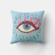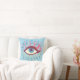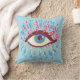 Psychedelische oogkussen met een kleurrijke illustratie van een raar blauw oog met grote gekrulde roze wimpers, lichtblauwe tranen die overal stromen en veel roze en groene elementen - uitbreidingen van de wimpers.