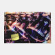 Het kunstwerk op deze deurmat is een originele foto van ZoeSPEAK van een drumstel. De glanzende zwarte drums met hun zilveren velgen weerspiegelen de kleuren van de lichten in de studio, blues, rood en groen. Cymbals boven de drums wachten om te worden geslagen. Er is een optionele gele post it sticker met tekst die luidt "Welkom". Dit is ingesteld voor u om te personaliseren of te verwijderen als u dat wilt.
