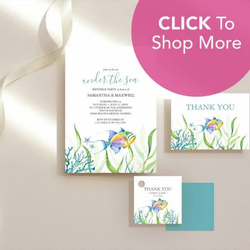 Deze bedankkaarten op maat voor een verjaardagsfeestje zijn voorzien van een waterverf tropische vis met een bodemboord van zee koraal, zeewier en zeesterren. Het ontwerp toont de woorden "Thank You" in de blauwe serif typografie. Gebruik de sjabloon velden om uw persoonlijke gegevens toe te voegen. Een charmante keuze voor een kinderverjaardagsfeestje. Ga naar www.zazzle.com/dotellabelle om de bijbehorende suite te bekijken
