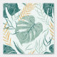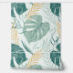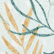 Tropische bladeren in groen en geel met een witte paisley patroon overlay.